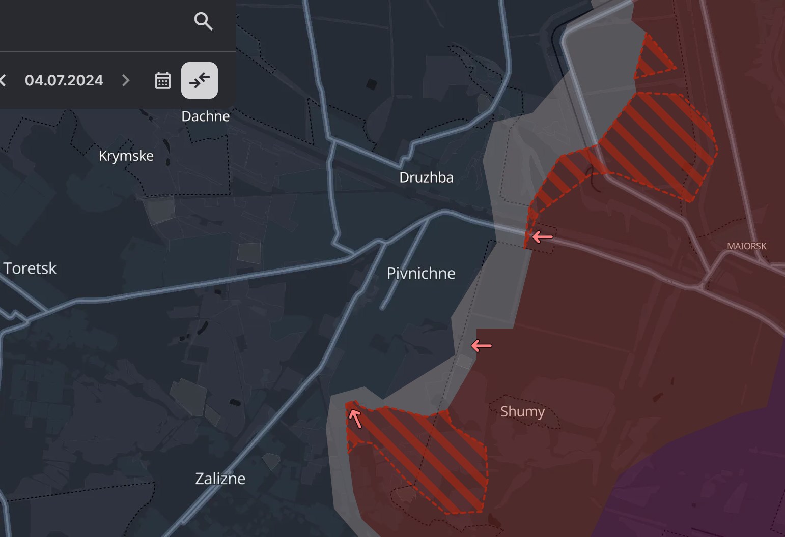 Южнее, на Торецком направлении, российские войска продвинулись в Северном и в районе Дружбы, сообщает паблик Deep State.
