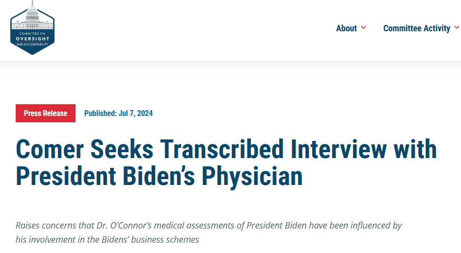 Председатель комитета по надзору и подотчетности Палаты представителей республиканец Джеймс Комер вызвал врача Джо Байдена Кевина О'Коннора, чтобы тот расшифровал интервью о медицинском обследовании президента. Комер также требует О'Коннора предоставить все имеющиеся у него документы, связанные с его участием в финансовой деятельности семьи Байденов.