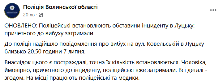 "В полицию поступило сообщение о взрыве по ул. Ковельской в ​​Луцке около 20:50 7 июля. В результате есть пострадавшие, точное их количество устанавливается. Мужчину, вероятно, причастного к инциденту, полицейские уже задержали. На месте работают полицейские и медики", - говорится в сообщении полиции.