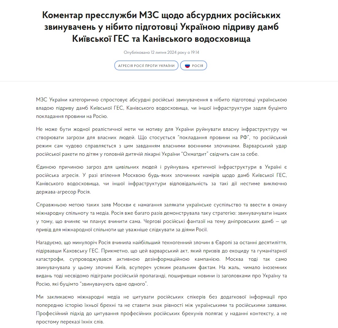 "МИД Украины категорически опровергает абсурдные российские обвинения в якобы подготовке украинскими властями подрыва дамб Киевской ГЭС, Каневского водохранилища или иной инфраструктуры для возложения вины на Россию. Не может быть никаких реалистичных целей или мотивов для Украины разрушать собственную инфраструктуру или создавать угрозы для собственных людей. Что касается "возложения вины на РФ", то российский режим сам прекрасно справляется с этой задачей собственными военными преступлениями. Варварский удар российской ракеты по детям в главной детской больнице Украины "Охматдет" свидетельствует сам за себя", - сказано в комментарии.