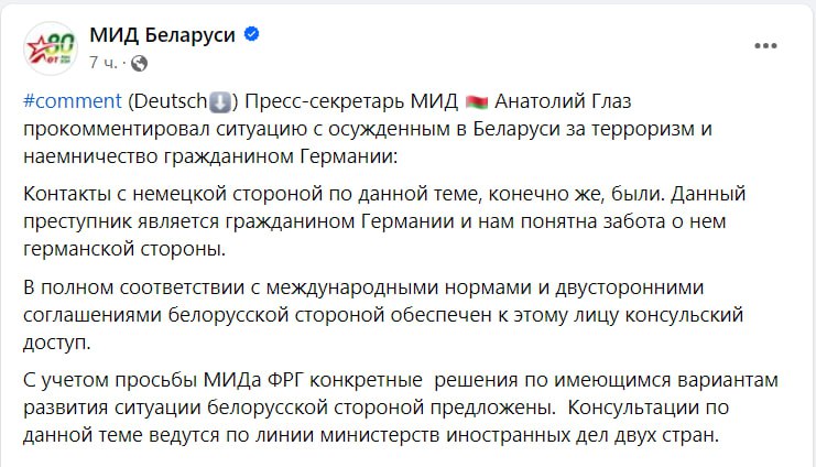 Белорусский МИД подтвердил приговор и заявил, что к осуждённому пустили немецкого консула. Статьи обвинения официально не называют.