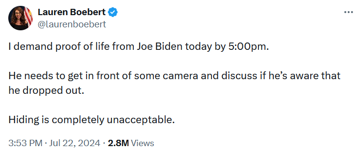Конгрессвумен Лорен Боберт потребовала от главы Белого дома Джо Байдена до вечера понедельника, 22 июля, представить доказательства того, что он жив, назвав молчание президента "недопустимым".