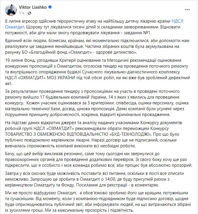 По словам Ляшко, договор с победителем тендера еще не подписан. Министр написал, что из-за резонанса, который вызвал выбор победителя тендера, в "Охматдете" проведут брифинг совместно с руководством больницы и ее благотворительного фонда.