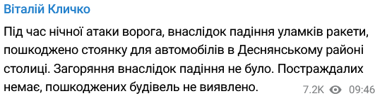 Также в Киеве ночью было падение обломков сбитой ракеты. Об этом сообщил мэр города Виталий Кличко.