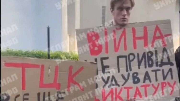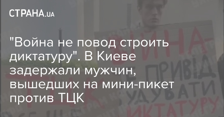 В Киеве двое молодых мужчин вышли на одиночный пикет с плакатами "ТЦК всё ещё похищает людей" и "Война не повод строить диктатуру".