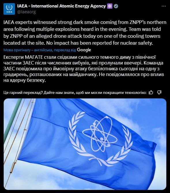 23:24 МАГАТЭ передает сообщения россиян об ударе беспилотника по градирне (охладительному агрегату) Запорожской АЭС.