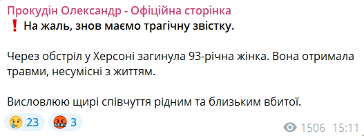 "Из-за обстрела в Херсоне погибла 93-летняя женщина. Она получила травмы, несовместимые с жизнью", - написал он.