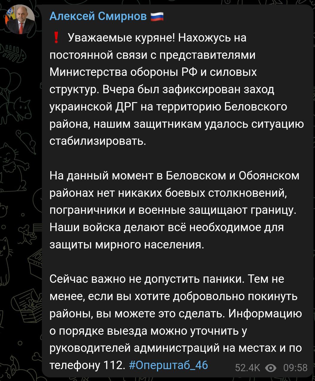 11:18 Губернатор Курской области Смирнов подтвердил, что в Беловский район вчера заходила "украинская ДРГ".