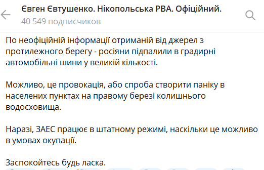 "Энергодар. Фиксируем из Никополя, что российские оккупанты устроили пожар на территории Запорожской атомной станции.