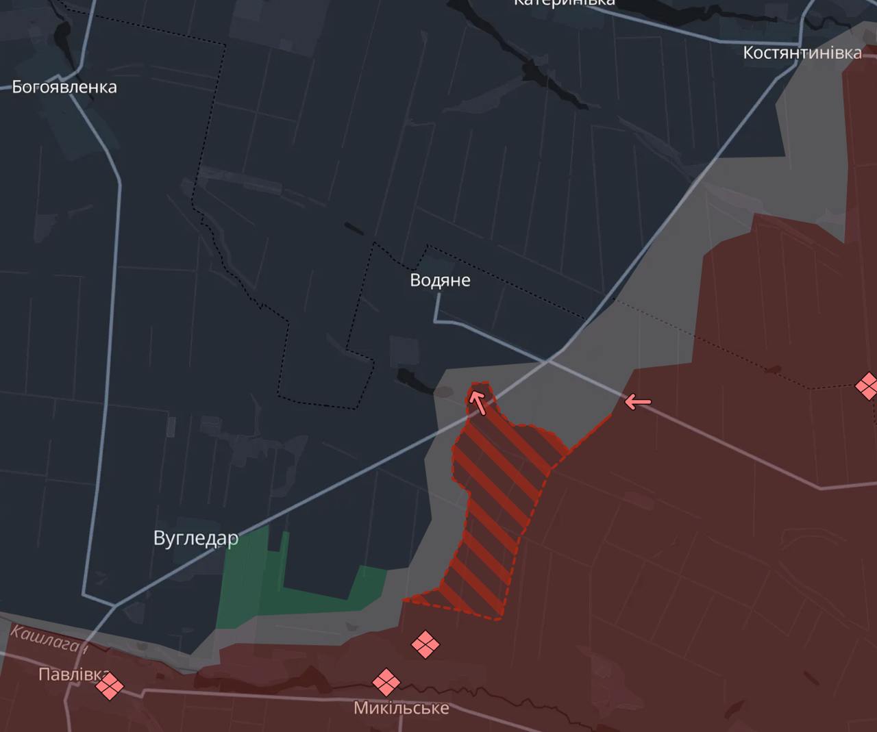 Крупное продвижение у РФ наблюдается и под Угледаром. Там российские войска перерезали трассу на Константиновку, приблизившись к Водяному. Таким образом, с северо-востока город Угледар блокирован.