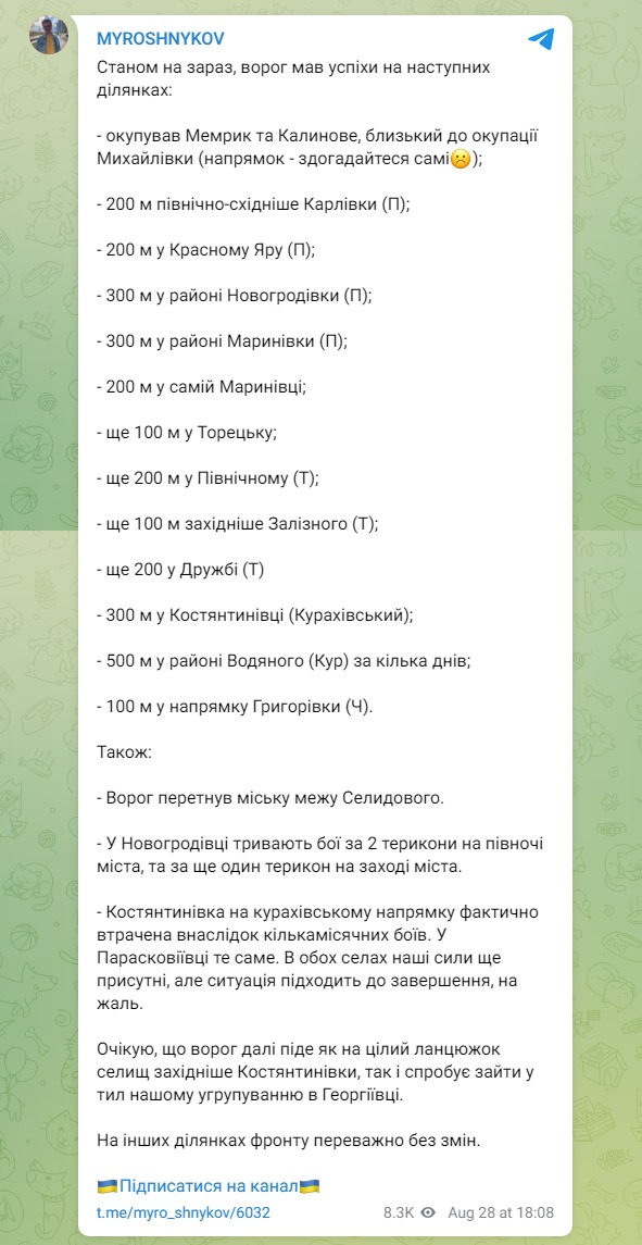 Также Мирошников подтвердил информацию Deep State о захвате российской армией Мемрика и Калиново и добавил, что она близка к тому, чтобы захватить Михайловку. Все эти населенные пункты находятся на Покровском направлении.