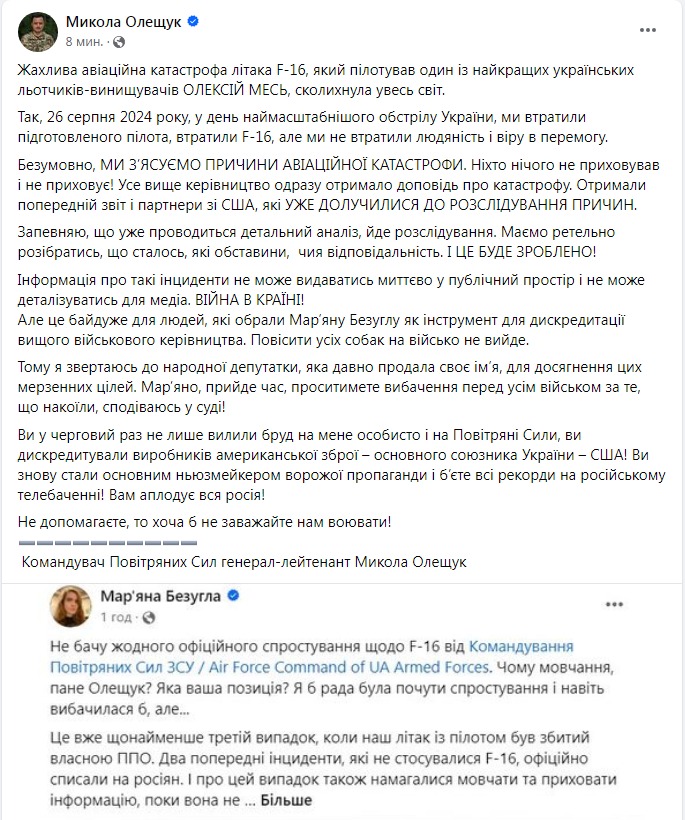 Командующий Воздушными силами Николай Олещук публично раскритиковал народного депутата Марьяну Безуглую и тех, кто "избрал ее как инструмент для дискредитации высшего военного руководства", из-за новостей о потере первого F-16.