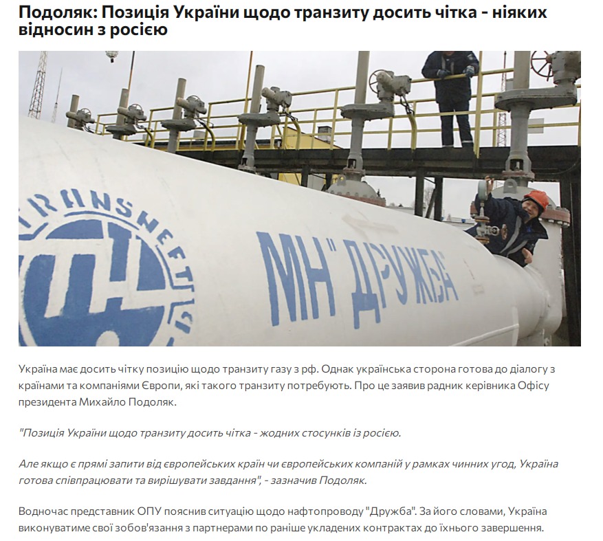 Подоляк опроверг собственное заявление о том, что Украина остановит транзит российской нефти в ЕС с 1 января