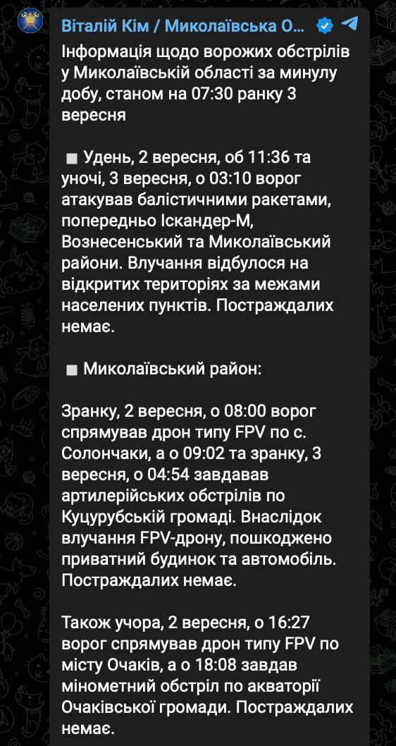 07:50 Власти Николаевской области подтвердили, что вчера были два удара "Искандерами" "по открытой террритории" - под Вознесенском и Николаевом.