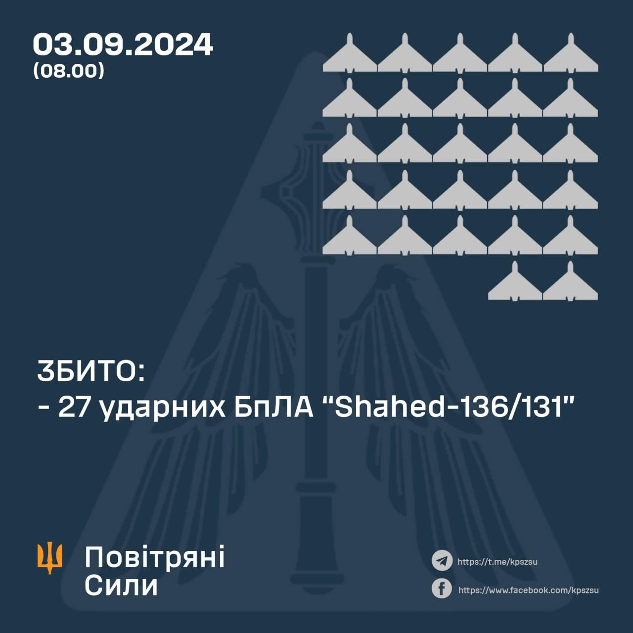 Сбито 27 "Шахедов", сообщили Воздушные силы.