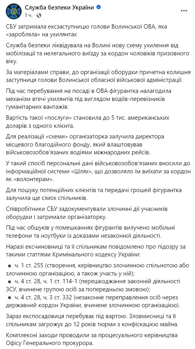 По данным следствия, будучи на должности в ОВА, за 5 тысяч долларов она содействовала внесению мужчин в систему "Шлях" для выезда за границу под видом водителей-перевозчиков гуманитарных грузов в благотворительном фонде.