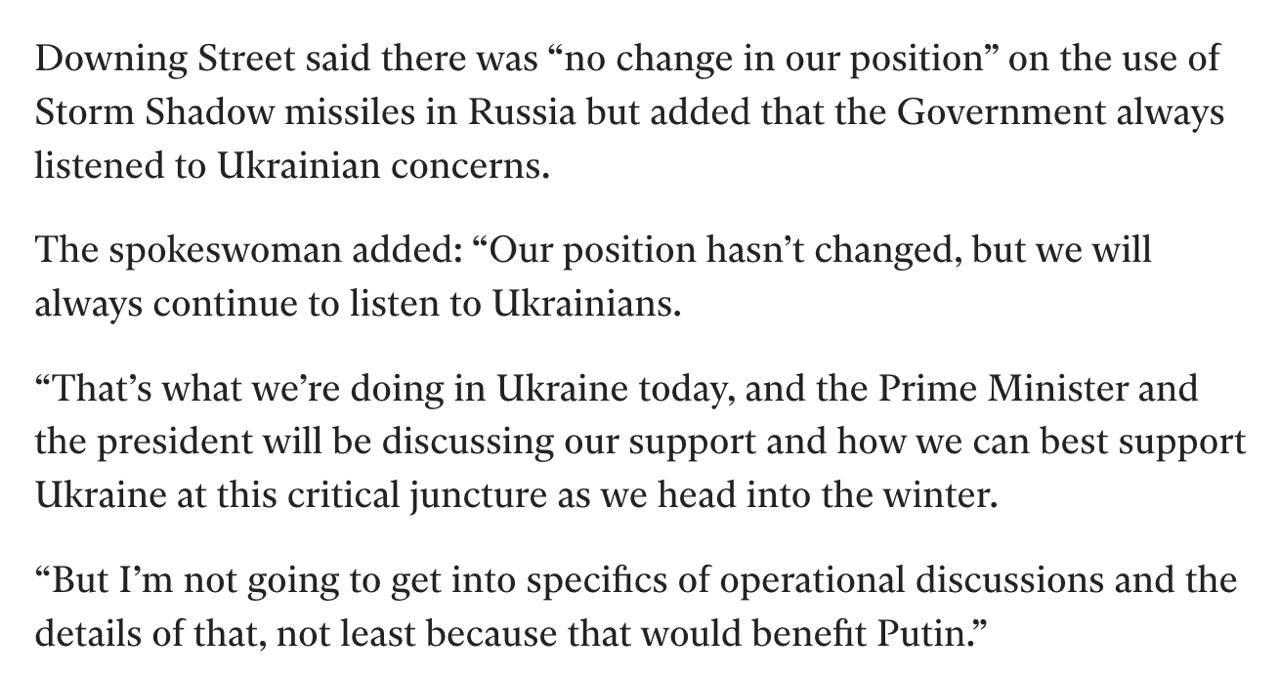 Между тем позиция Великобритании по поводу позволения Украине на дальнобойные удары по территории РФ не изменилась: они по-прежнему запрещены.