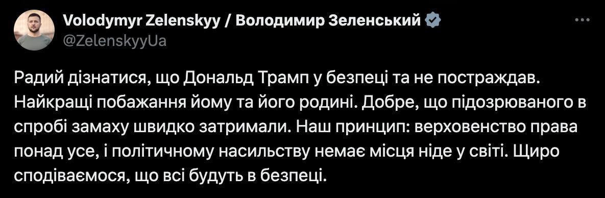 "Рад узнать, что Дональд Трамп в безопасности и не пострадал. Лучшие пожелания ему и его семье. Хорошо, что подозреваемого в попытке покушения быстро задержали. Наш принцип: верховенство права превыше всего, и политическому насилию нет места нигде в мире. Искренне надеемся, что все будут в безопасности", - написал президент.