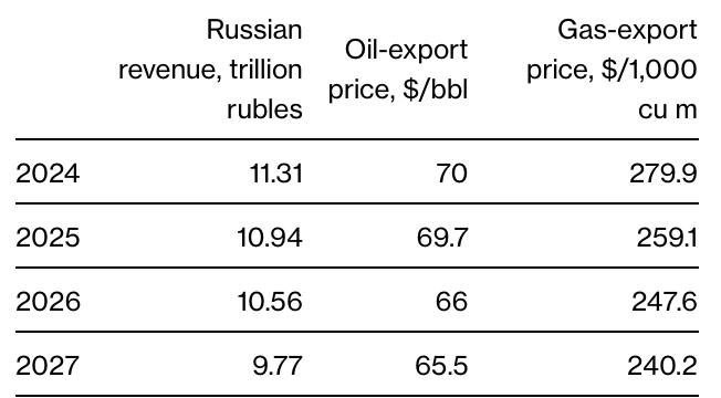 В правительстве РФ предполагают, что средняя экспортная цена российской нефти должна упасть ниже $70 за баррель уже со следующего года. Также ожидается снижение контрактных цен на экспорт газа до 2027 года.