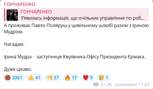 Кроме того, по данным нардепа Алексея Гончаренко, Поляруш является гражданским мужем заместителя главы Офиса президента Ирины Мудрой.