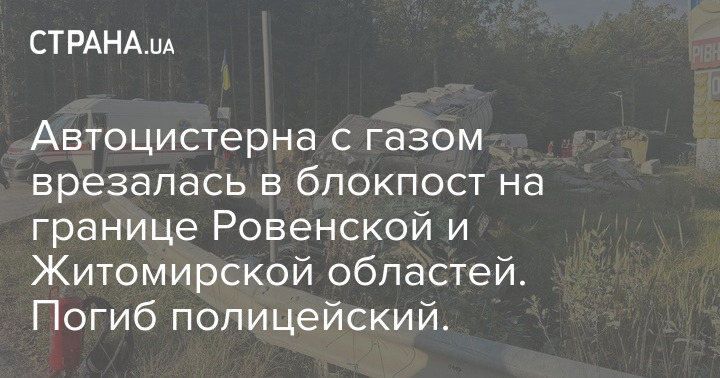 Сегодня утром автоцистерна с газом врезалась в блокпост на границе Ровенской и Житомирской областей. Погиб полицейский.