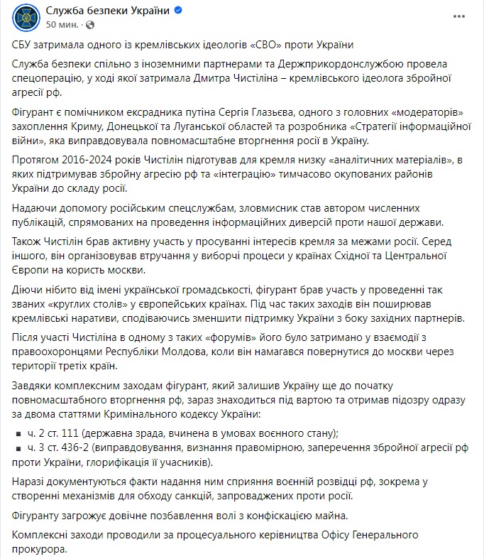 СБУ заявляет, что с 2016 года Чистилин готовил для Кремля "аналитические материалы", в которых "поддерживал вооруженную агрессию России", делал публикации аналогичного характера, а также ездил по Европе, позиционируя себя как представитель украинской общественности.