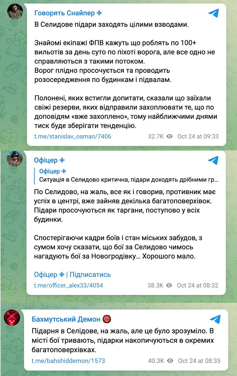 "По Селидово, к сожалению, все как и говорил, противник имеет успех в центре, уже занял несколько многоэтажек. Наблюдая кадры боев и состояние городских застроек, с грустью хочу сказать, что бои за Селидово чем-то напоминают бои за Новогродовку (населенный пункт около Селидово, который россияне в августе захватили практически без боя - Ред.) Хорошего мало", - пишет офицер ВСУ с позывным Алекс.