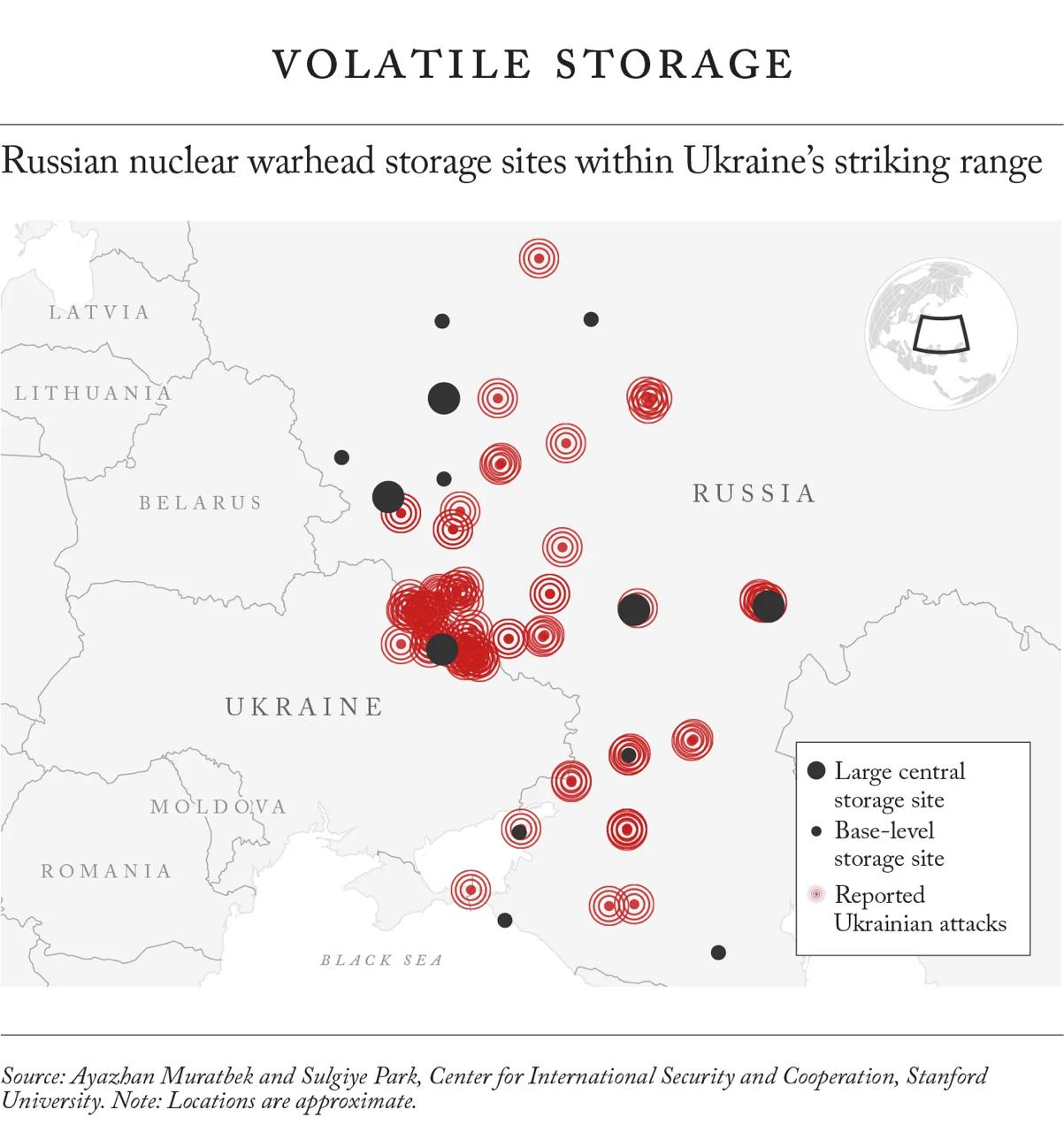 В пределах досягаемости украинских ракет и беспилотников находится по крайней мере 14 российских ядерных хранилищ.