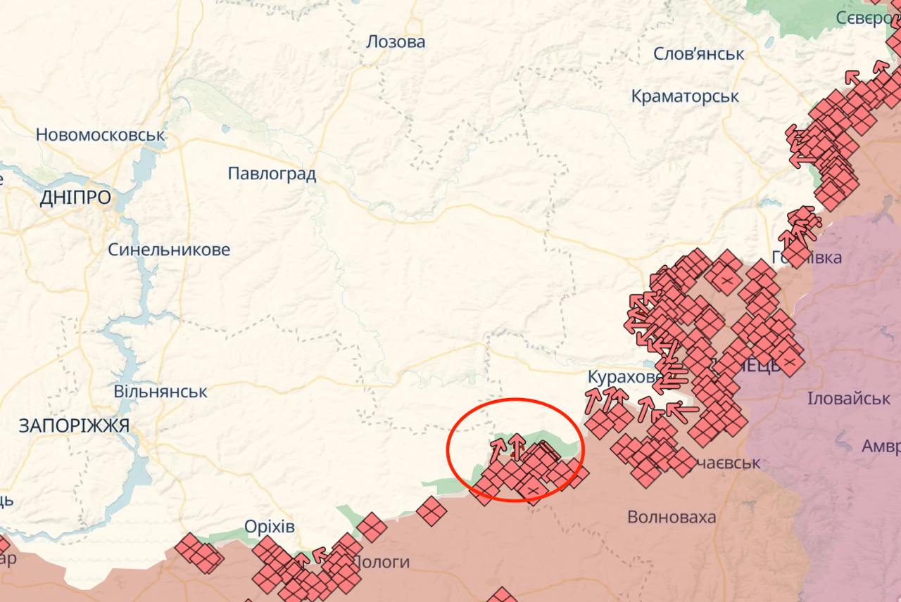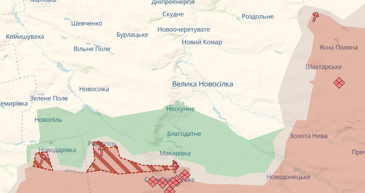 12.35 Армия РФ существенно продвинулась на юге Донецкой области под Великой Новоселкой, свидетельствует карта украинского паблика Deep State.