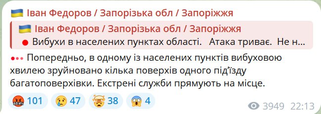 21.23 О взрывах в Запорожской области сообщил глава ОВА Федоров.