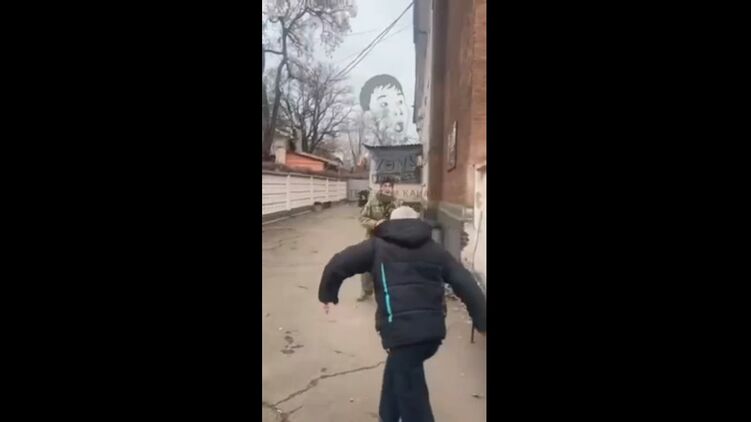 Один из военкомов боролся с человеком в чёрной одежде и повалил на землю, на помощь гражданскому пошёл пожилой мужчина, после чего другой сотрудник ТЦК произвёл выстрел очередью из автомата.