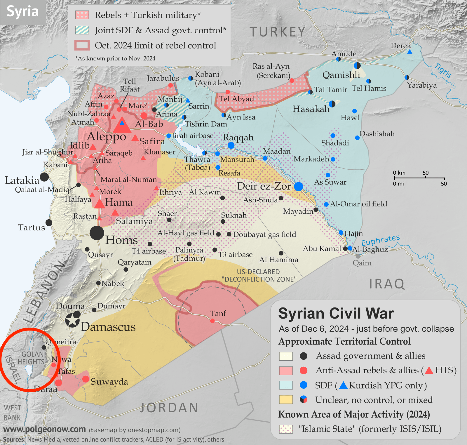 На юго-западе Сирии вторжение начал Израиль, захвативший сирийскую часть Голанских высот и вторгшийся в города за их пределами. По одной из версий - чтобы перерезать логистику для Ливана. По другой - с целью поставить под свой контроль всю Южную Сирию. Что интересно, никто среди сирийских группировок, сбросивших Асада, против этого вторжения не протестует.