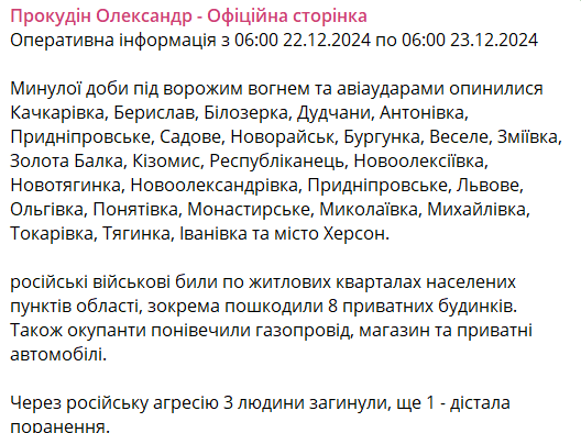 08:00 За прошедшие сутки в результате российских обстрелов в Херсонской области 3 человека погибли, еще 1 - получил ранения.