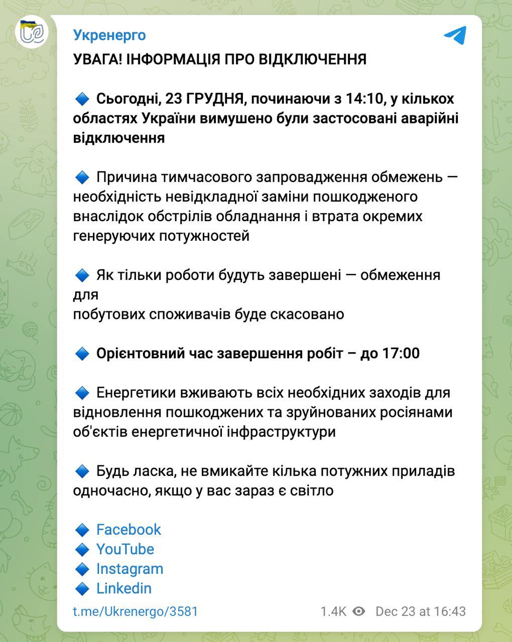 16:45 Аварийные отключения по Украине планируют отменить до 17:00, сообщает Укрэнерго.