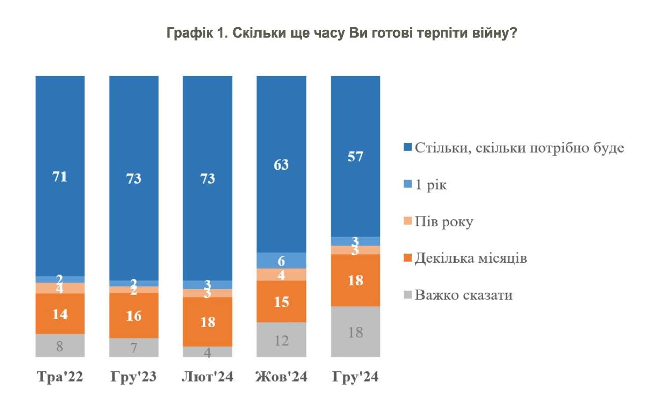 В Украине падает число готовых терпеть войну "сколько потребуется", свидетельствует опрос КМИС. Пик готовности был зимой 2023-2024 годов (73%), с тех пор показатель снижается. В октябре 2024 уже был 63%, а в декабре - 57%.