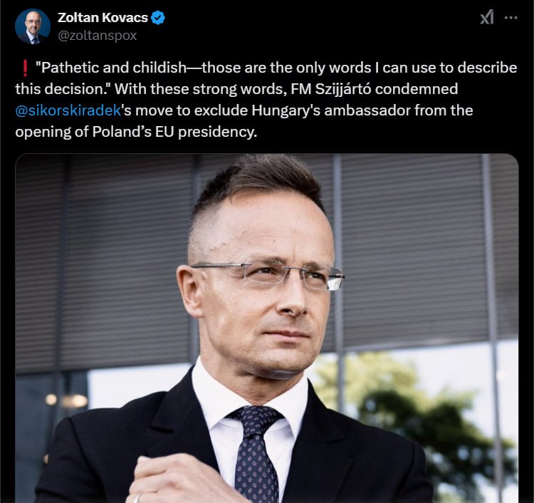 "Жалко и по-детски - это единственные слова, которыми я могу описать это решение", - написал госсекретарь по публичной дипломатии и связям с общественностью Венгрии Золтан Ковач в соцсети Х передавая слова главы МИД Петера Сийярто.