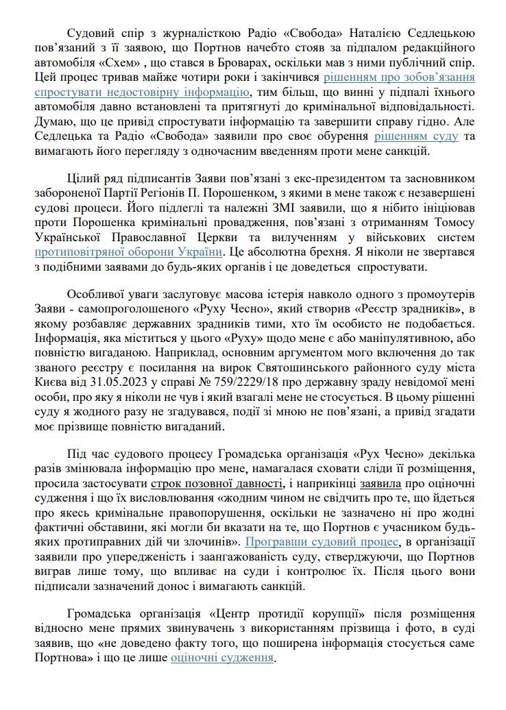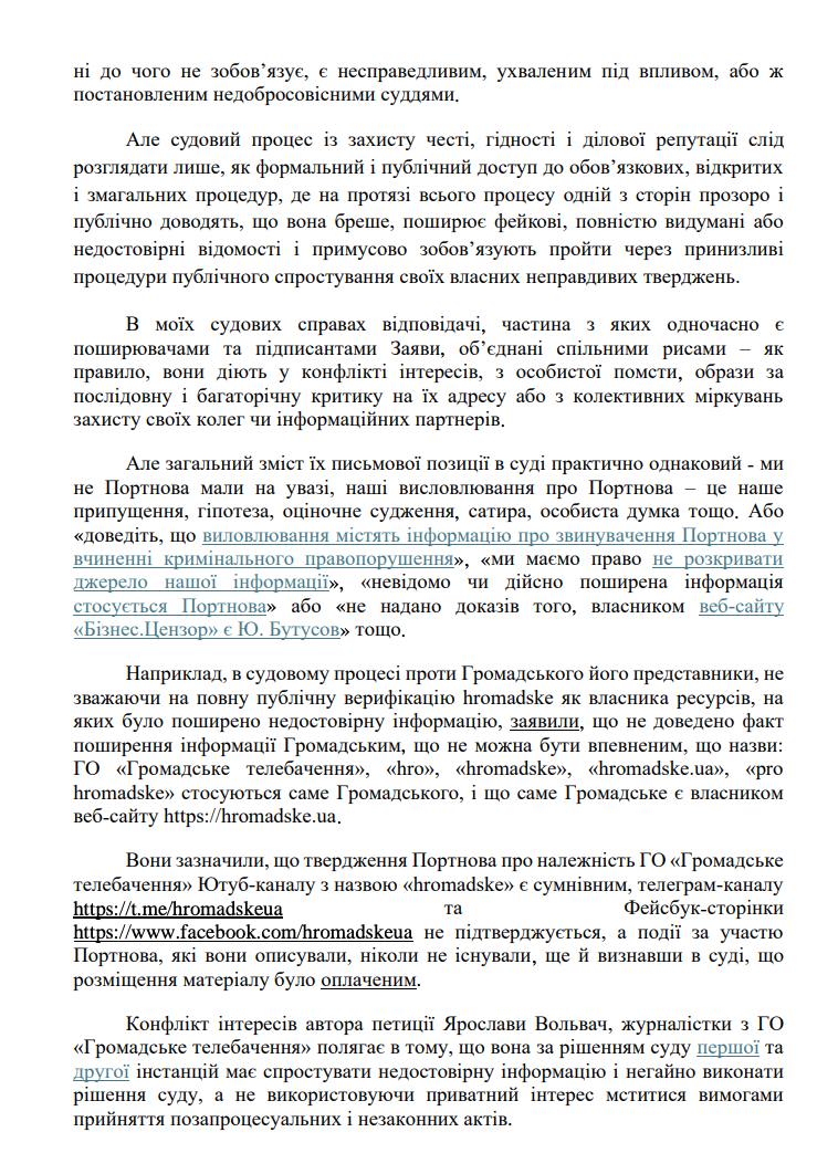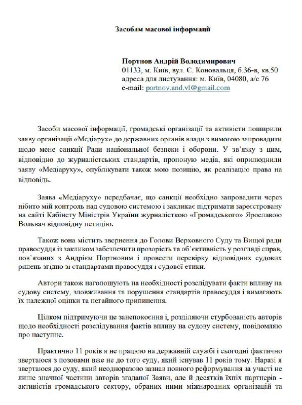 Что же касается инициативы "Медиаруха", то она является попыткой мести Портнову, который неоднократно выигрывал у активистов суды о защите чести и достоинства. считает юрист. Портнов заявил, что призывы активистов к руководителям судебной системы проверить уже принятые судебные решения - это прямой форма давления на судебную систему.