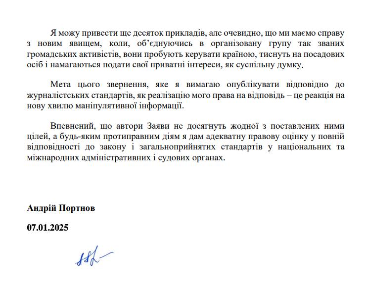 В ответ Портнов обвинил авторов заявления в давлении на судебную систему и отверг свое влияние на суды.
