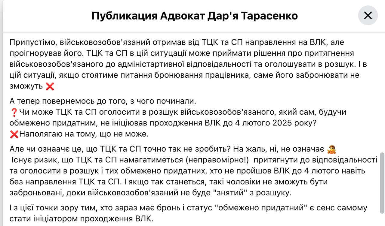 "Допустим, военнообязанный получил от ТЦК и СП направление на ВВК, но проигнорировал его. ТЦК и СП в этой ситуации может принимать решение о привлечении военнообязанного к административной ответственности и объявлять в розыск. И в этой ситуации, если будет стоять вопрос бронирования работника, именно его забронировать не смогут", - пишет Тарасенко.
