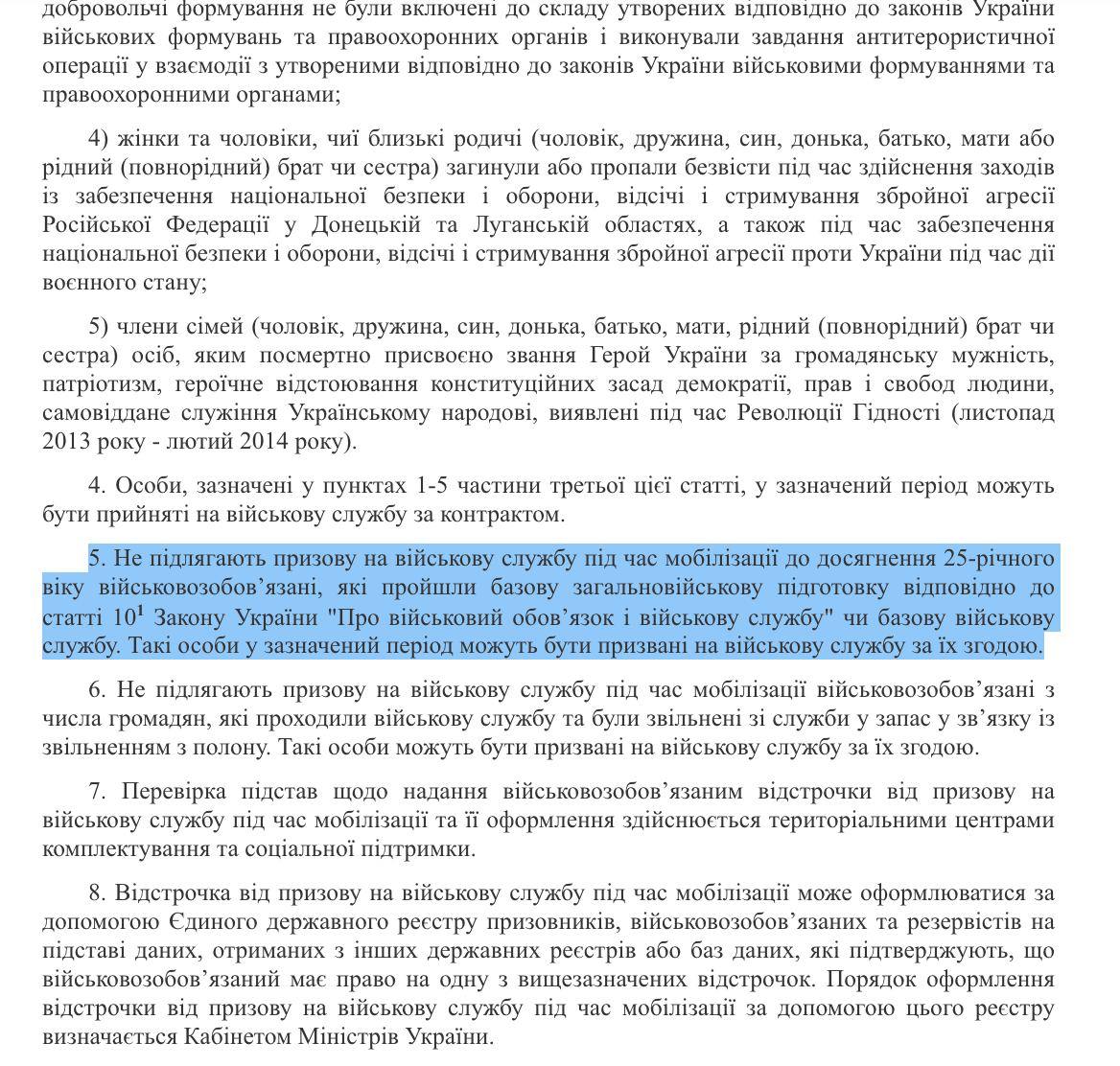 В сети опубликован фрагмент закона, в котором написано, что "не подлежат призыву на военную службу во время мобилизации до достижения 25-летнего возраста военнообязанные, прошедшие базовую общевойсковую подготовку… или базовую военную службу".