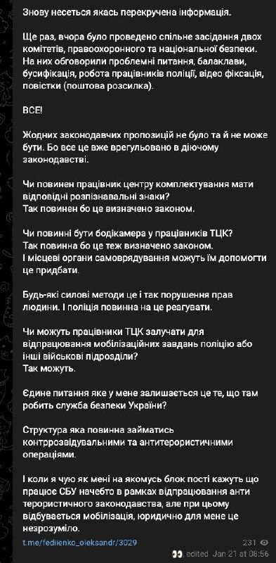 "Еще раз: вчера было проведено совместное заседание двух комитетов, правоохранительного и национальной безопасности. На них обсудили проблемные вопросы: балаклавы, бусификация, работа сотрудников полиции, видеофиксация, повестки (почтовая рассылка). Все! Никаких законодательных предложений не было и не может быть. Ибо все это уже урегулировано в действующем законодательстве!" - сообщил член оборонного комитета Федиенко.