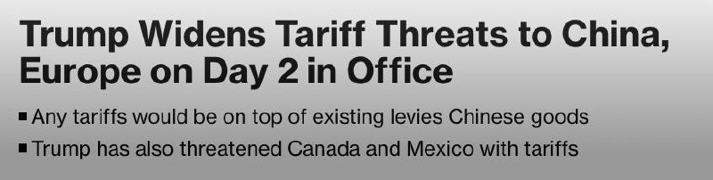 На второй день своего президентства Трамп усилил свои тарифные угрозы в адрес Китая и Европы, а также грозит тарифами Канаде и Мексике.