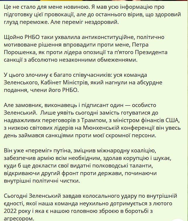 Ранее Зеленский в вечернем обращении заявил, что опубликует решение о санкциях СНБО завтра, 13 февраля.