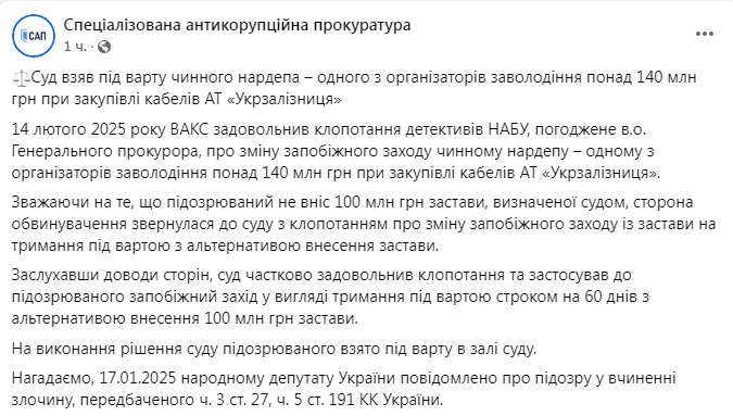 ВАКС удовлетворил ходатайство детективов НАБУ об изменении меры пресечения действующему нардепу, утвержденное и.о. генерального прокурора.