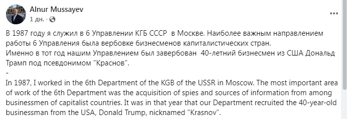 По словам Мусаева, в 1987 году он работал в Шестом управлении советского ведомства госбезопасности, и тогда Москвой оказался завербован 40-летний американский бизнесмен Трамп, которому дали псевдоним Краснов.