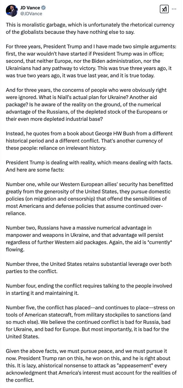 "Учитывая вышеизложенные факты, мы должны стремиться к миру, и мы должны стремиться к этому сейчас. Президент Трамп баллотировался с этим, он победил с этим, и он прав в этом. Это ленивая, неисторическая чушь - нападать как на "умиротворение" ("умиротворение агрессора" - одно из обвинений сейчас в адрес Трампа, который хочет закончить войну в Украине на компромиссной основе - Ред.), на признание того, что интересы Америки должны учитывать реалии конфликта. Именно этот интерес, а не морализм или историческая безграмотность, будет определять политику президента Трампа в ближайшие недели", - заявил Вэнс.