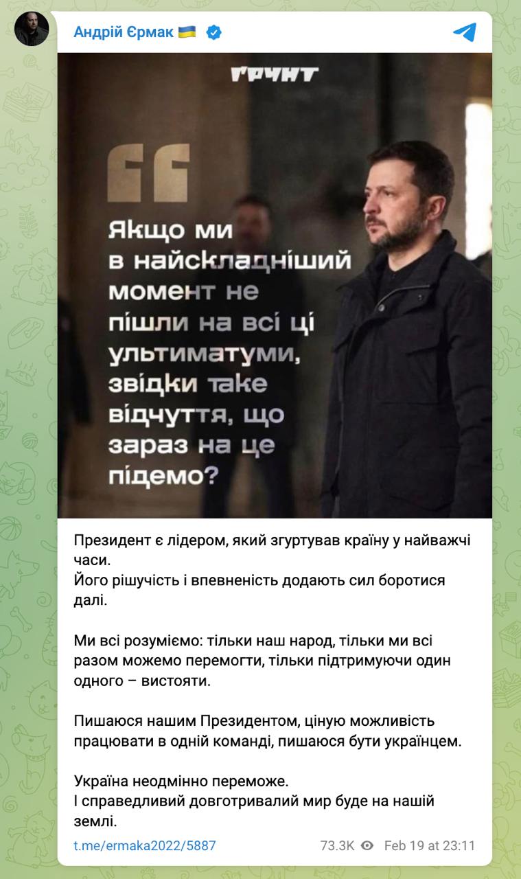 "Президент является лидером, сплотившим страну в самые тяжелые времена. Его решительность и уверенность придают силы бороться дальше. Мы все понимаем: только наш народ, только мы все вместе можем победить, только поддерживая друг друга – выстоять", - написал глава ОП Ермак.