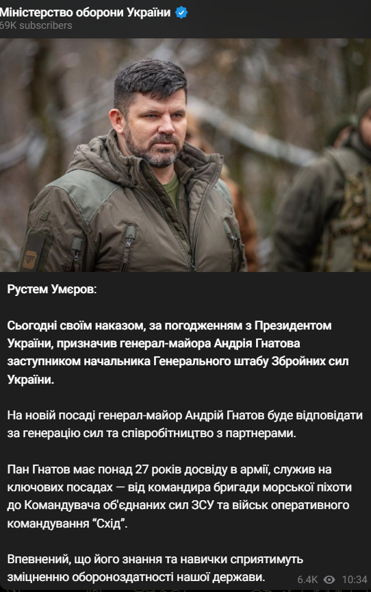 Также он отметил, что Гнатов имеет более 27 лет опыта в армии, служил на ключевых должностях – от командира бригады морской пехоты до Командующего объединенных сил ВСУ и войск оперативного командования "Восток".