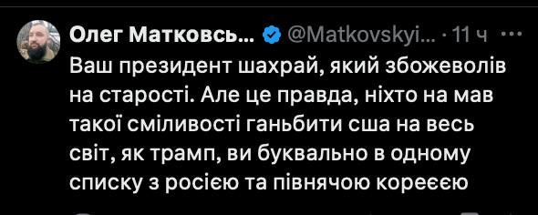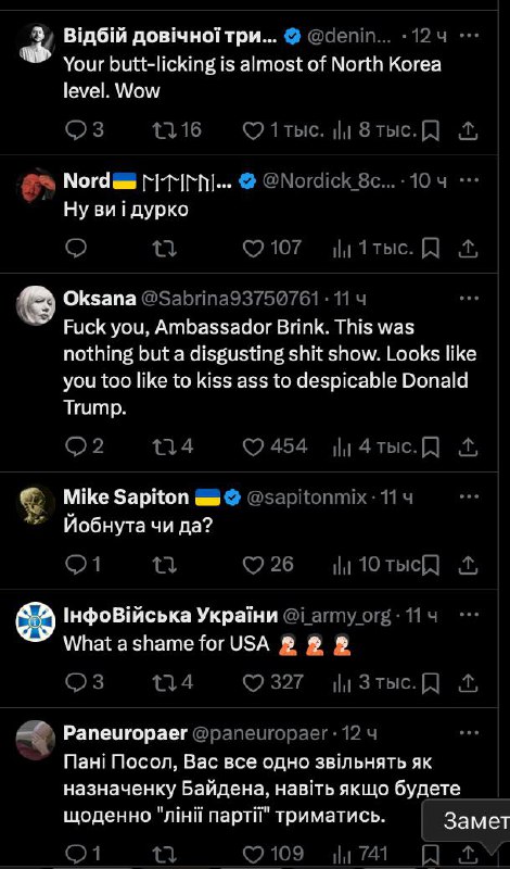 "Ваш президент мошенник, который сошел с ума на старости лет", "Иди на х…й, посол Бринк. Это было просто отвратительное дерьмовое шоу. Похоже, ты тоже любишь целовать задницу презренному Дональду Трампу" (перевод с английского языка).