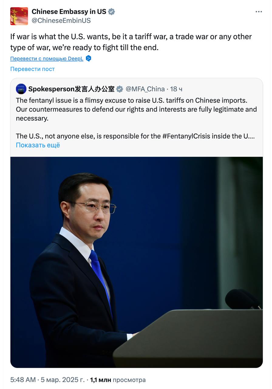 "Если война - это то, чего хотят США, будь то тарифная война, торговая война или любой другой тип войны, мы готовы сражаться до конца", - заявляет МИД Китая.